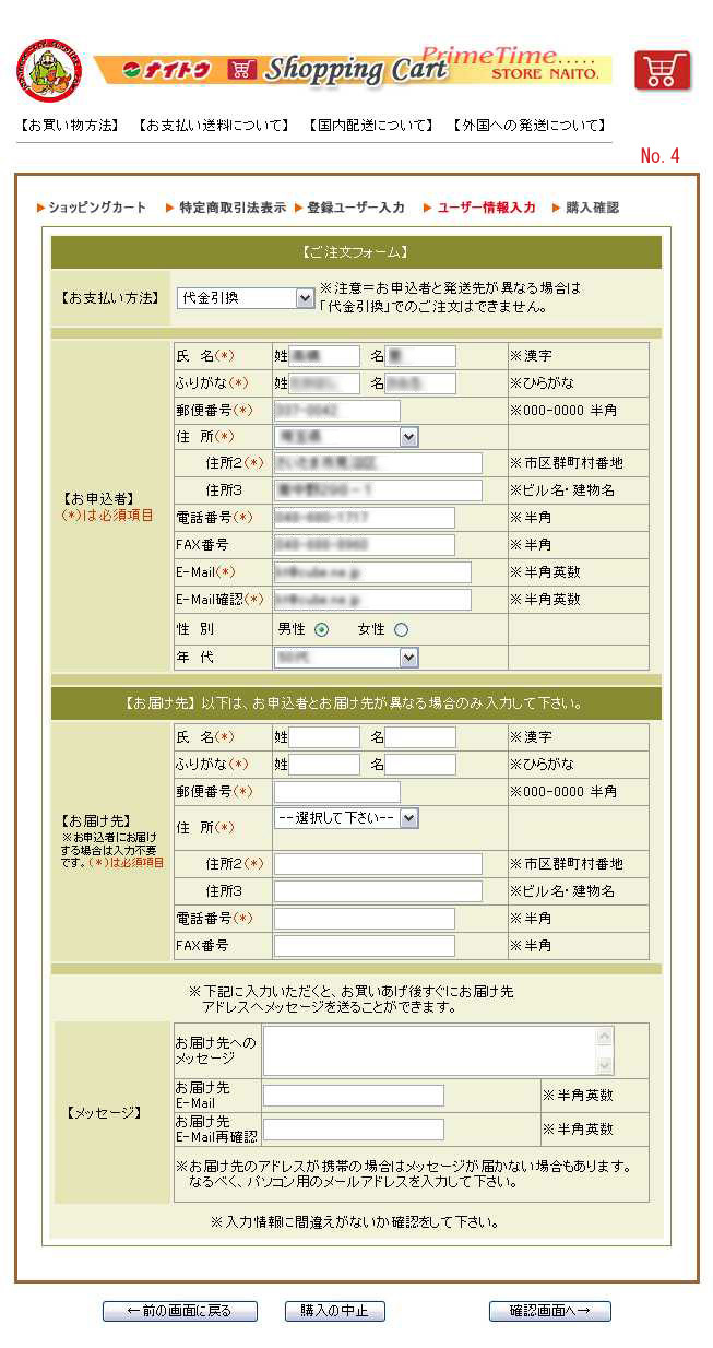 | No4…最初に一番上にあるお支払い方法をお選びください。 既に登録ユーザー様は、お客様の情報欄は登録時のユーザー情報が表示されています。お届け先が別な場合は、 【お届け先】欄に入力ください。お申し込み者とお届け先が同じ場合は入力の必要はありません。 ※最下段のメッセージ欄に入力いただいたメッセージがお届け先の方に届きます。(メールアドレスが違っていないか、 確認ください。なお、フリーメールへの送信の場合はメールが届かない場合ががあります。) |