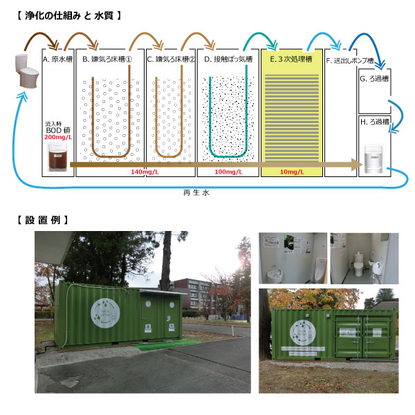 | 排水を自己処理できる循環型トイレDRAIN・Cle・Cle は、トイレで流した排水を浄化処理及び、高度処理を行い、再生水として排水を循環させるシステムです。運転開始時に一度、水を水槽に充填した後は、水洗トイレの水を循環して使用できるので、新たに水の供給が不要な究極の節水型トイレで、日常では、環境負荷を軽減し、災害時には避難生活の負担を軽減する。インフラに頼らない環境と快適を同時に支え守るシステムです。 |